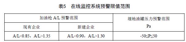 6.3.4 在24 h(自然日)內(nèi),在線監(jiān)控系統(tǒng)應(yīng)監(jiān)測(cè)和保存每次加油的A/L,當(dāng)每條加油槍有效A/L(每次連續(xù)加油量大于15 L)處于表5規(guī)定范圍的次數(shù)達(dá)到總次數(shù)的25%,在線監(jiān)控系統(tǒng)應(yīng)預(yù)警,連續(xù)5 d出現(xiàn)預(yù)警狀態(tài)應(yīng)報(bào)警,若當(dāng)日某加油槍加油次數(shù)小于5次時(shí),在線監(jiān)控系統(tǒng)不對(duì)該加油槍進(jìn)行A/L預(yù)警和報(bào)警判斷,并與次日加油次數(shù)進(jìn)行累計(jì),直至大于等于5次后再進(jìn)行A/L預(yù)警和報(bào)警判斷;在線監(jiān)控系統(tǒng)應(yīng)自動(dòng)關(guān)閉A/L報(bào)警的加油槍.