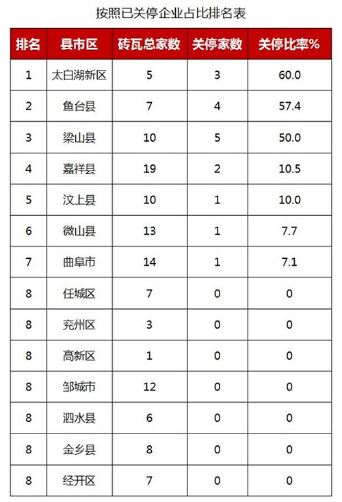 目前,濟(jì)寧市磚瓦企業(yè)整合重組工作穩(wěn)步推進(jìn),122家磚瓦企業(yè)中,17家企業(yè)已關(guān)停,包括曲阜1家,魚臺4家,梁山5家,汶上1家,太白湖3家,嘉祥2家,微山1家;105家企業(yè)處于前期,其中任城7家,兗州3家,高新1家,曲阜13家,鄒城12家,泗水6家,微山12家,魚臺3家,金鄉(xiāng)8家,嘉祥17家,汶上9家,梁山5家,太白湖2家,經(jīng)開區(qū)7家;按照已關(guān)停企業(yè)占比進(jìn)行排名,排在前三名的縣市區(qū)為太白湖新區(qū)、魚臺縣、梁山縣,關(guān)停占比分別為60.0%、57.4%、50.0%。