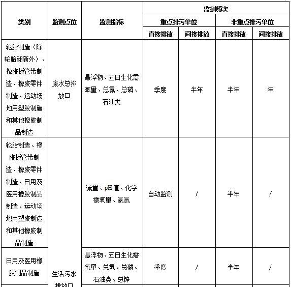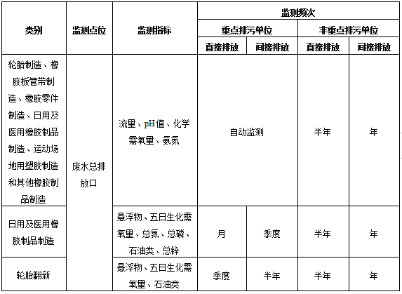 表1橡膠制品工業(yè)排污單位廢水排放監(jiān)測(cè)點(diǎn)位、監(jiān)測(cè)指標(biāo)及最低監(jiān)測(cè)頻次