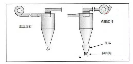 不恰當(dāng)?shù)男痘以O(shè)計能造成粉塵的二次夾帶。比如許多人認(rèn)為風(fēng)機設(shè)在除塵器上游時,除塵器進行正壓運行,此時不必設(shè)灰斗或卸灰閥。這是不對的。事實上,旋風(fēng)除塵器內(nèi)部向上的旋流不管是由正壓或負(fù)壓產(chǎn)生的,都具有夾帶粉塵的能力。在任何情況下,灰斗和卸灰閥都必須納入設(shè)計考慮之中(圖3)。
