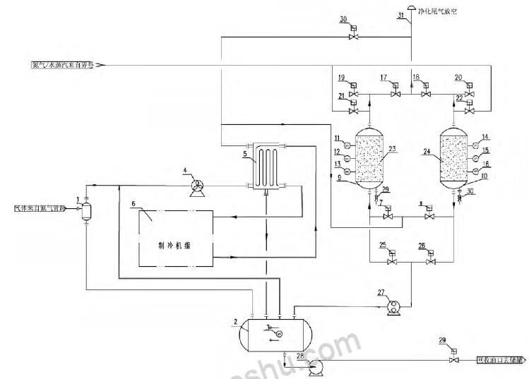 1 - 凝液收集罐; 2 - 氣液分離罐; 3 - 液位變送器; 4 - 風(fēng)機; 5 - 冷箱; 6 - 制冷機組; 7 - 吸附罐進(jìn)口閥A; 8 - 吸附罐進(jìn)口閥B; 9 - 吸附罐A; 10 - 吸附罐B; 11 - 溫度變送器A; 12 - 溫度變送器B; 13 - 溫度變送器C; 14 - 溫度變送器D; 15 - 溫度變送器E; 16 - 溫度變送器F; 17 - 吸附罐出口閥A; 18- 吸附罐出口閥B; 19 - 吸附罐破真空閥A; 20 - 吸附罐破真空閥B; 21 - 吹掃氣進(jìn)口閥A; 22 - 吹掃氣進(jìn)口閥B; 23 - 吸附劑床層A; 24 - 吸附劑床層B; 25 - 真空脫附閥A; 26 - 真空脫附閥B; 27 - 真空泵; 28 - 回液泵; 29 - 外輸液流量開關(guān)閥;30 - 緊急放空閥; 31 - 排放筒