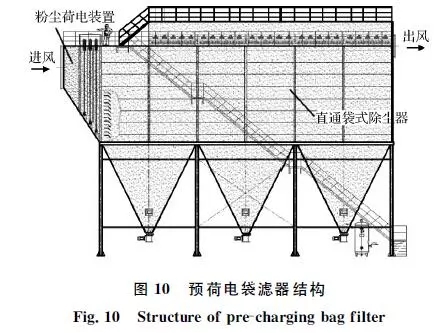 針對轉(zhuǎn)爐二次煙氣的排放特征,中鋼集團天澄環(huán)??萍脊煞萦邢薰鹃_發(fā)了預(yù)荷電袋濾器除塵技術(shù),將預(yù)荷電和直通式袋式除塵器復(fù)合形成一體化裝置,如圖10所示。粉塵預(yù)荷電后在濾袋表面將形成海綿狀粉餅結(jié)構(gòu),能提高凈化效率,同時降低運行阻力。中鋼天澄在鞍鋼煉鋼總廠2×180t轉(zhuǎn)爐二次煙氣凈化項目中建成示范工程,處理風(fēng)量2×60萬m3/h。2014年12月正式投運,截止目前持續(xù)穩(wěn)定,運行可靠,顆粒物排放質(zhì)量濃度低于10mg/m3,技術(shù)性能指標達到超低排放,運行阻力為700~1 000Pa,低于傳統(tǒng)袋式除塵器。目前,在日照鋼鐵、新余鋼鐵、正大特鋼、唐鋼青龍、柳鋼等得到推廣應(yīng)用。