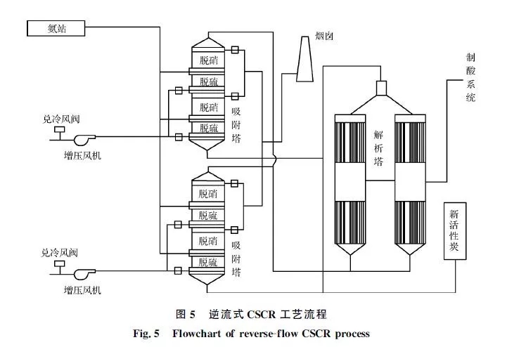 河鋼邯鋼在國內(nèi)率先選用了逆流式活性炭選擇性催化還原(CSCR)凈化燒結(jié)煙氣工藝,工藝流程如圖5所示。SO2通過活性炭的吸附-解析,再經(jīng)過催化氧化制成濃硫酸,實現(xiàn)了資源回收利用。通過脫硫段后,在上升的煙氣中進行噴氨,進入脫硝段后在活性炭的催化作用下NOx轉(zhuǎn)化為N2和水進行脫硝。2018年2月邯鋼西區(qū)燒結(jié)機投運了逆流式CSCR工藝,實現(xiàn)長周期穩(wěn)定運行和較高的煙氣凈化效率,2018年上半年原始煙氣顆粒物質(zhì)量濃度為50~130mg/m3,SO2質(zhì)量濃度為750~900mg/m3,NOx質(zhì)量濃度為300~400mg/m3,凈化后煙囪NOx排放質(zhì)量濃度低于50mg/m3,SO2排放質(zhì)量濃度低于10mg/m3,固體顆粒物排放質(zhì)量濃度低于15mg/m3。