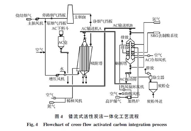 活性炭一體化工藝從煙氣和活性炭運動方式看可分為兩類:錯流式和逆流式。錯流式中活性炭和煙氣分別作垂直運動和水平運動,兩者在運動方向垂直接觸,在國內(nèi)應(yīng)用相對較早,典型有太鋼、日照等。逆流式工藝中活性炭自上而下、煙氣自下而上,兩者逆流相向接觸,在國內(nèi)河鋼邯鋼將逆流式工藝首次應(yīng)用于燒結(jié)煙氣處理。